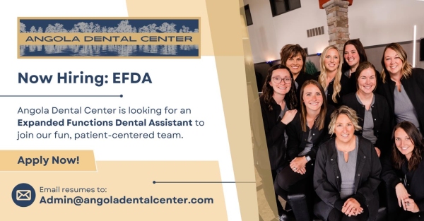 Angola Dental Center is looking for an Expanded Functions Dental Assistant to join our fun, patient-centered team. If you’re ready to grow in a practice that values excellence, teamwork, and a positive culture, we’d love to meet you.