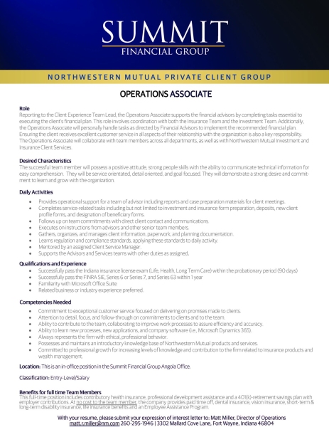 Reporting to the Client Experience Team Lead, the Operations Associate supports the financial advisors by completing tasks essential to executing the client's financial plan. This role involves coordination with both the Insurance Team and the Investment Team. Additionally, the Operation Associate will personally handle tasks as directed by Financial Advisors to implement the recommended financial plan. Ensuring the client receives excellent customer service in all aspects of their relationship with the organization is also a key responsibility. The Operations Associate will collaborate with team members across all departments, as well as with Northwestern Mutual Investment and Insurance Client Services.
