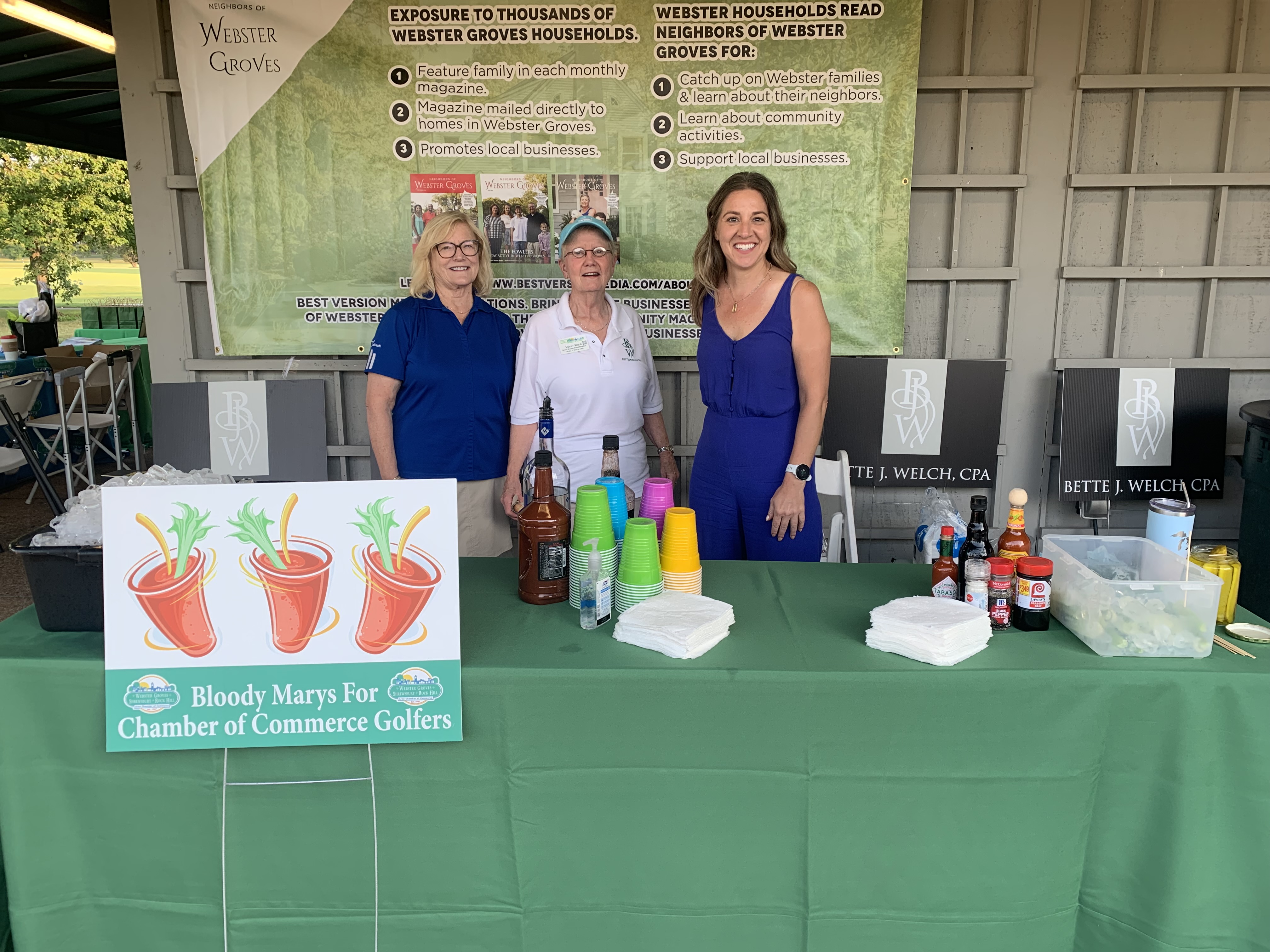 2023 Chamber Golf ScrambleSunrise Living's Alan Davis, CoC Membership Manager Tamera Clair and Sunrise Living's Chef Jarvis serve hot dogs Aleo Prime Event Co-Chair Chris Fowler and the Amada foursome City of Webster Groves ...and they're off! FastSigns golfer goodie bags, sponsored by James Carlton State Farm CoC Executive Director Karen Park with Alice Hulvey of Visiting Angels and CoC Membership Manager Tamera Clair Ree Hamlin of Neighbors of Webster Groves, Valery Welch of Bette J. Welch CPA and Diane Tarr of Business Throttle Lori Strawbridge CPA and group Tamera Clair thanks event sponsor, Quadrant Regions Bank of Webster Groves and ServPro groups Wagner Roofing & Construction Solutions | |