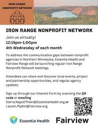 Join to address the communication gaps between nonprofit agencies in Northern Minnesota. Attendees can share and discover local events, project, and partnership opportunities, and regular agency updates. Essentia Health and Fairview Range will be launching regular Iron Range Nonprofit Network meetings every 4th Wednesday each month!