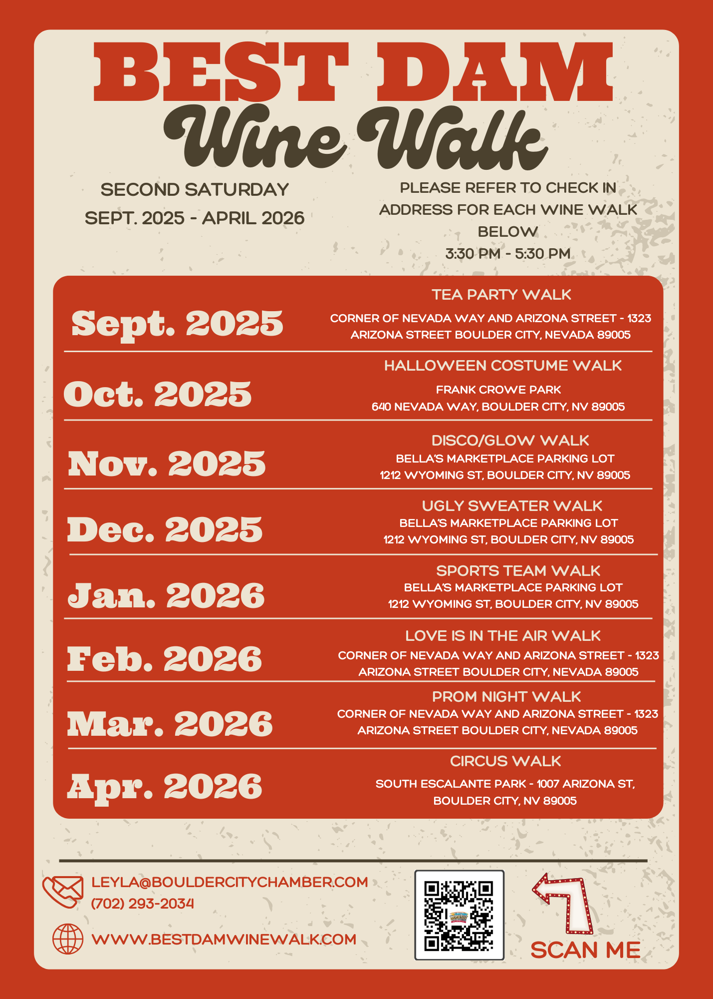 Ticket registration for the Best Dam Wine Walk is now open! Join us from September through April for an evening of strolling through Boulder City’s Historic District, enjoying wine, and exploring our local businesses.