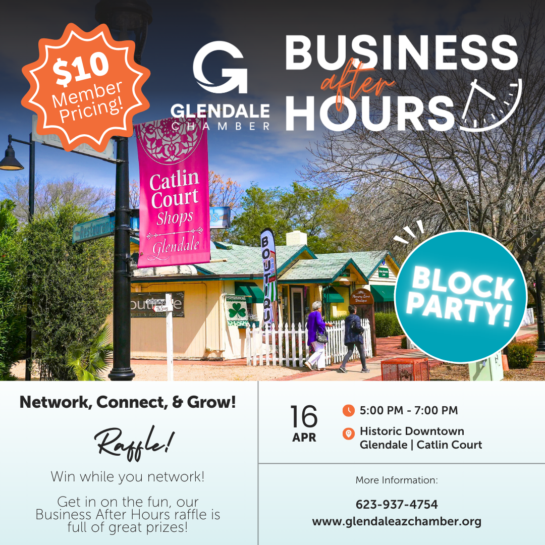 Event Details: Location - Block Party! | Historic Downtown Glendale: Catlin Court Check-In & Networking - 5:00PM-6:20PM Announcements Begin - 6:20PM Program Ends - 7:00PM *Adults only please