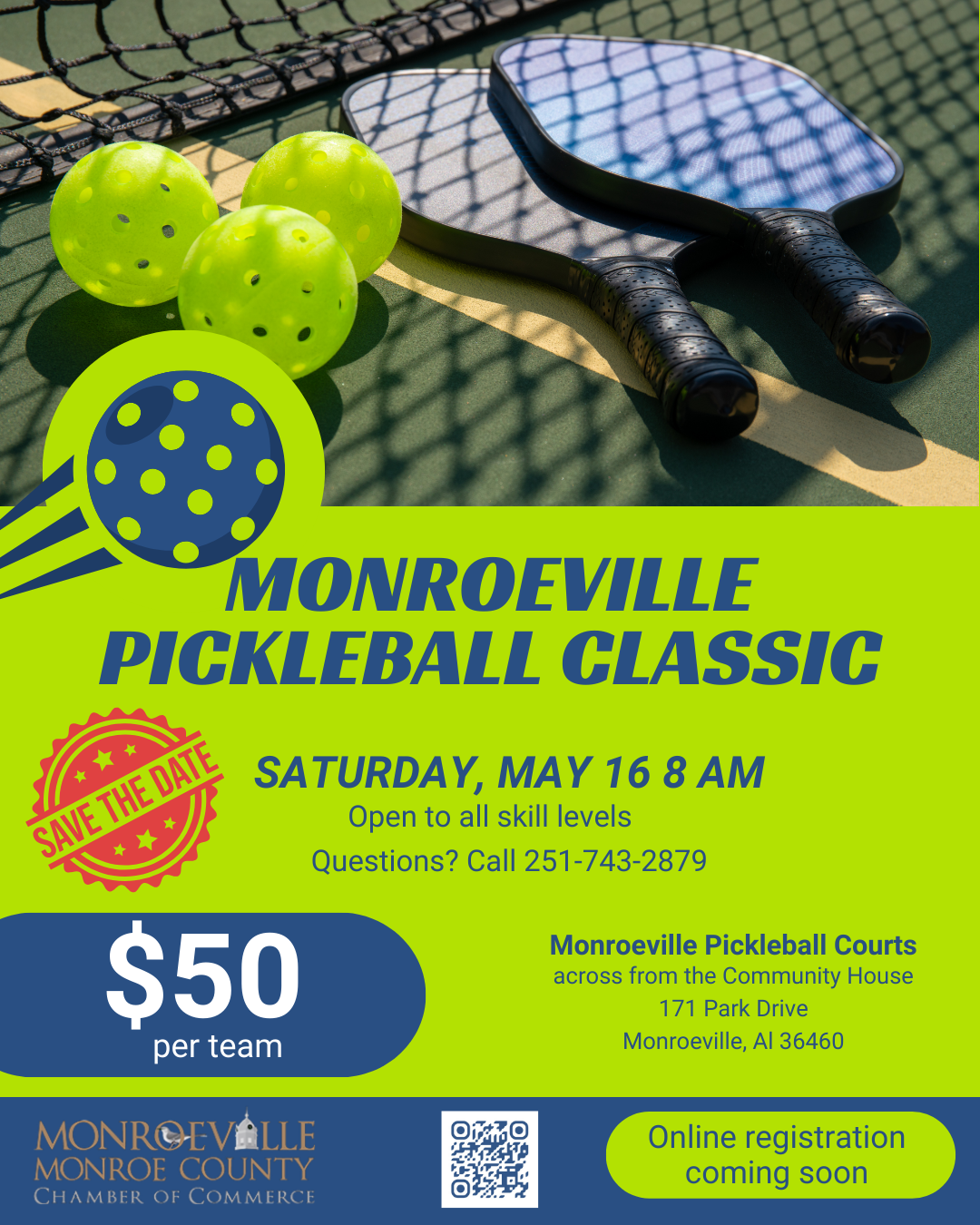 The Monroeville Pickleball Classic will be held on Saturday, May 16, 2026 beginning at 8 am. The tournament will be held at the Monroeville Pickleball courts located on Park Drive across from the Monroeville Community House. Registration is now open and the fee is $50 per team. Open to all skill levels. Questions? Call the Monroeville/Monroe County Chamber of Commerce at 251-743-2879.