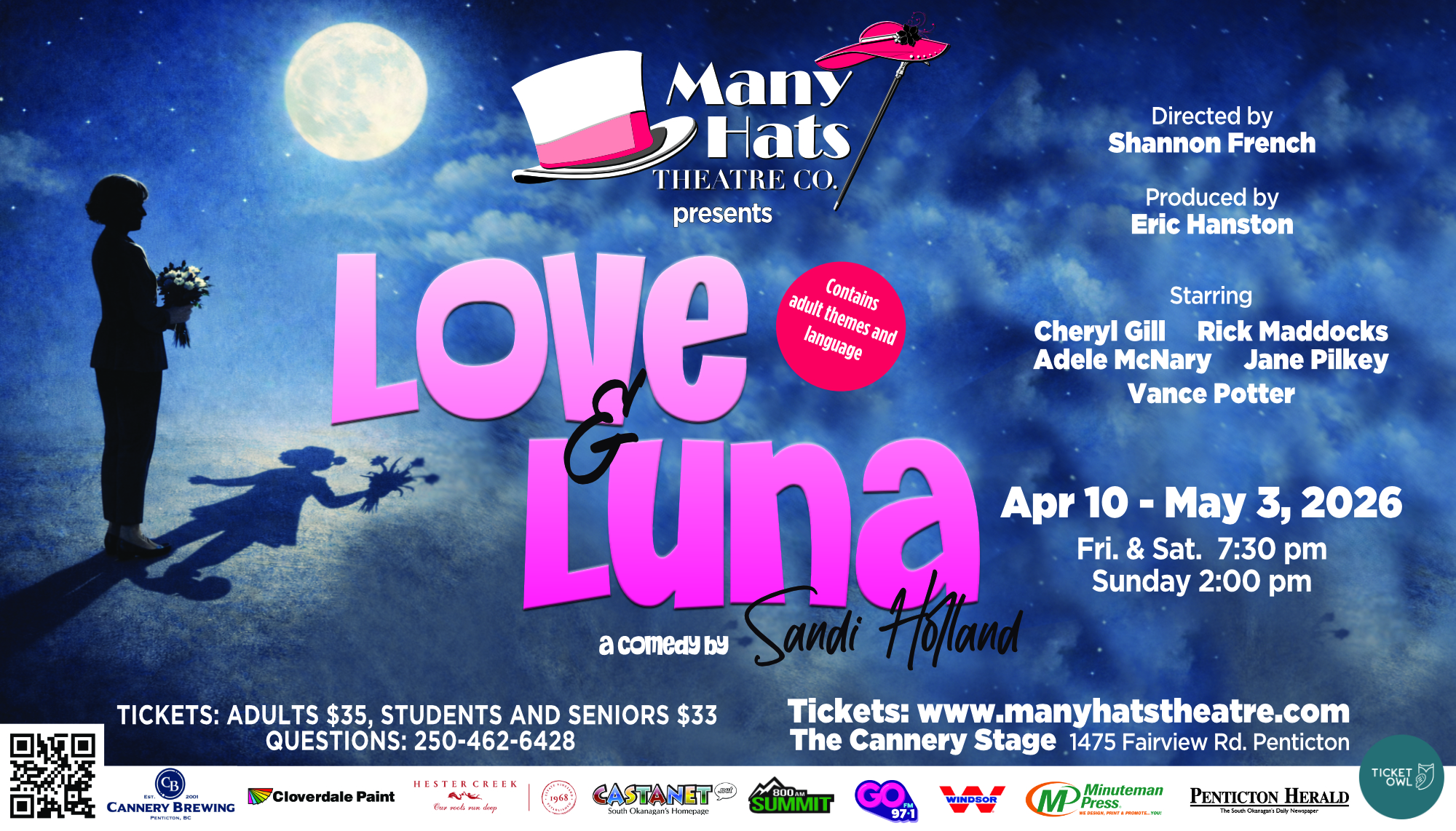 Love and Luna runs from April 10th to May 3rd 2026 on the Cannery Stage at 1475 Fairview Road in Penticton. For tickets visit our website www.manyhatstheatre.com or go to https://app.ticketowl.io/@manyhatstheatre . For further information or assistance with ticket purchases please call 250-462-6428.