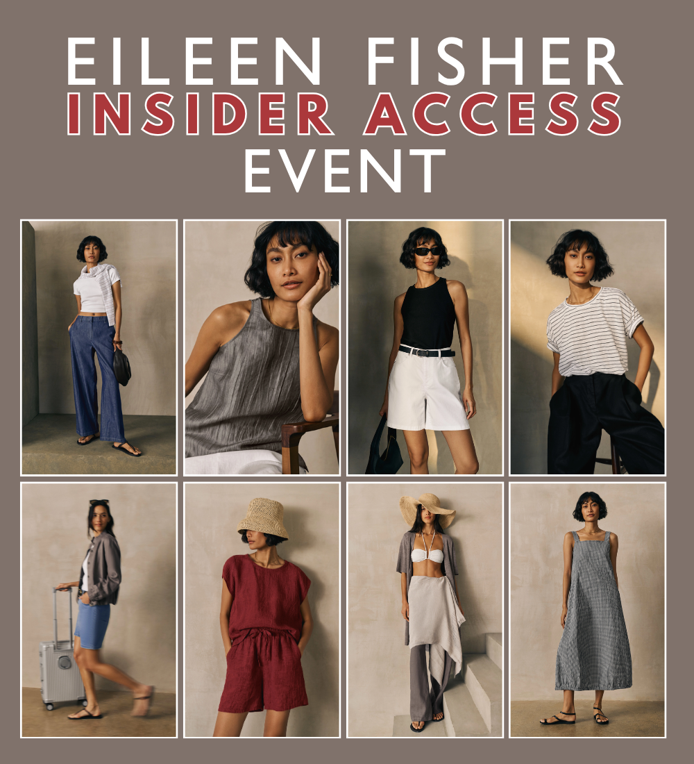 Save 20% on our entire Eileen Fisher collection, including special orders, and take home a gorgeous Eileen Fisher piece with your purchase of $350 or more. We'll be serving refreshments while you shop and featuring personalized styling advice to help you shop with confidence and a fresh perspective!