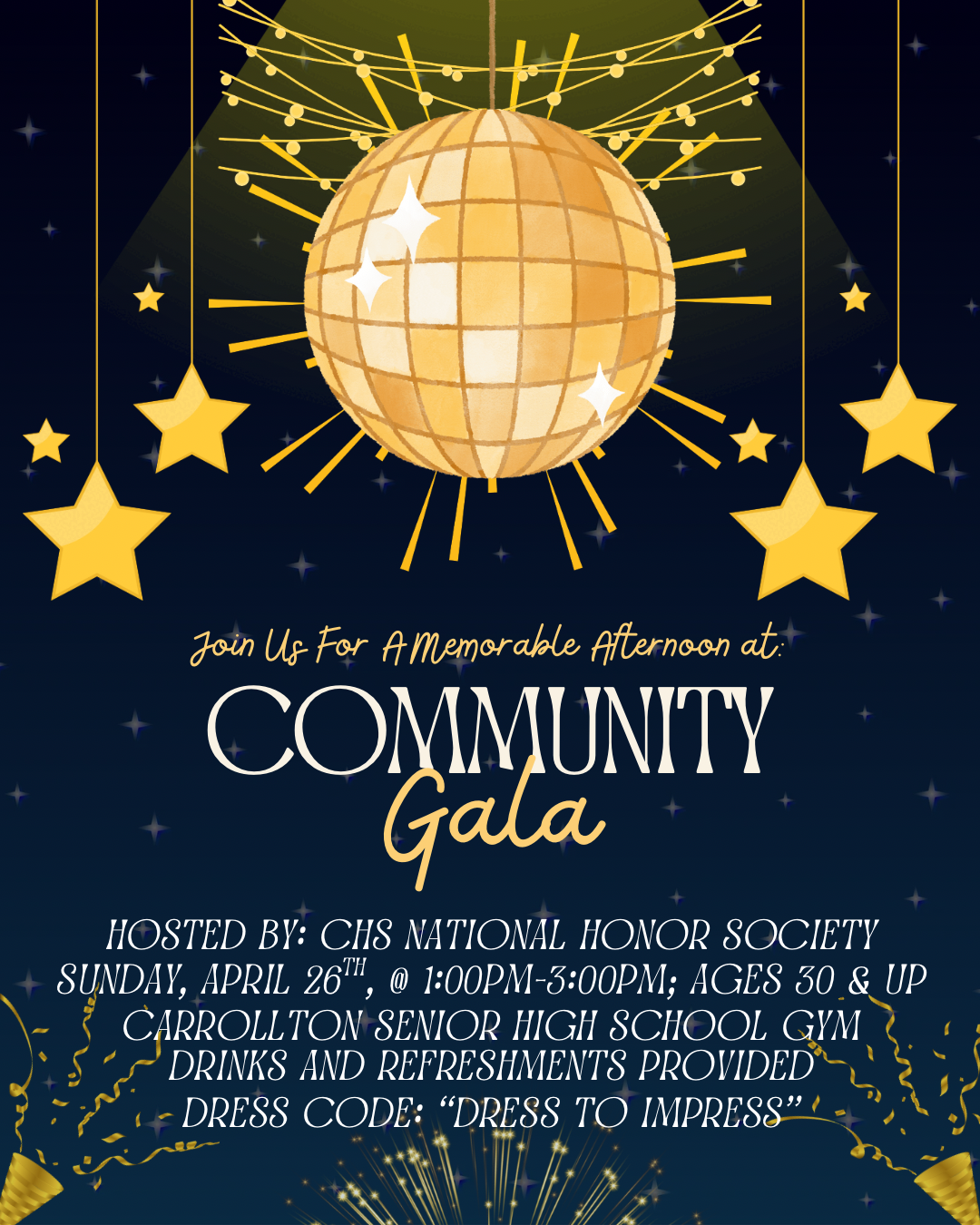 Community Gala for ages 30+ hosted by the CHS National Honor Society. Drinks and refreshments provided. Dress Code: Dress to Impress!