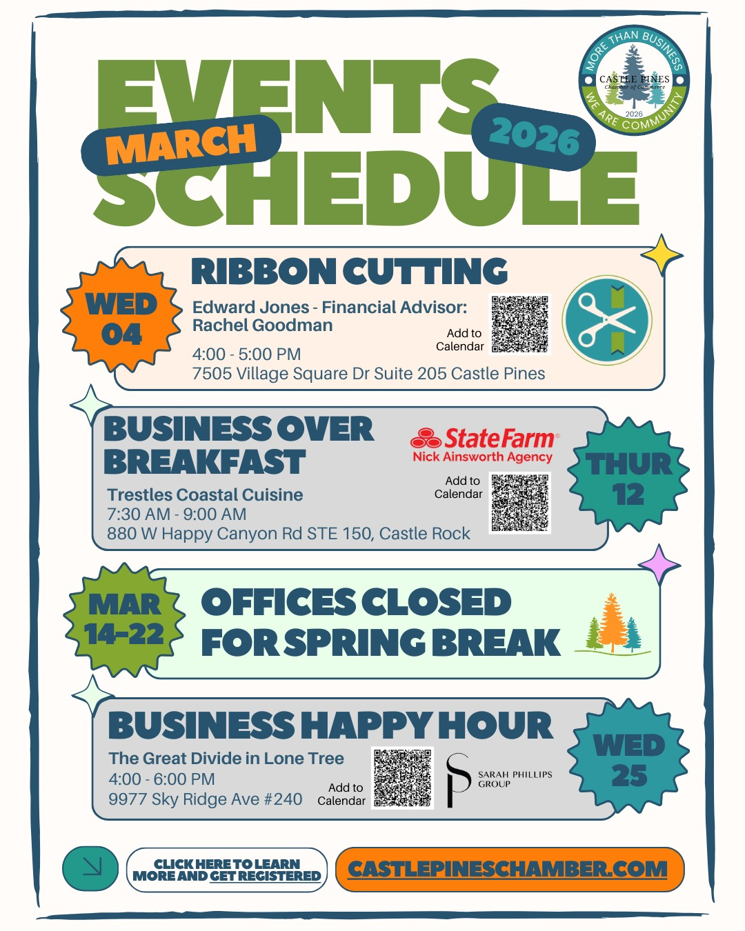 Spring is just around the corner, and March is full of opportunities to connect, collaborate, and grow. From celebrating local businesses at our Ribbon Cutting to gathering for Business Over Breakfast and Business Happy Hour, we’re excited to bring our community together in meaningful ways. As always, our goal is simple: to help you build relationships, increase visibility, and strengthen your presence in the Castle Pines business community.