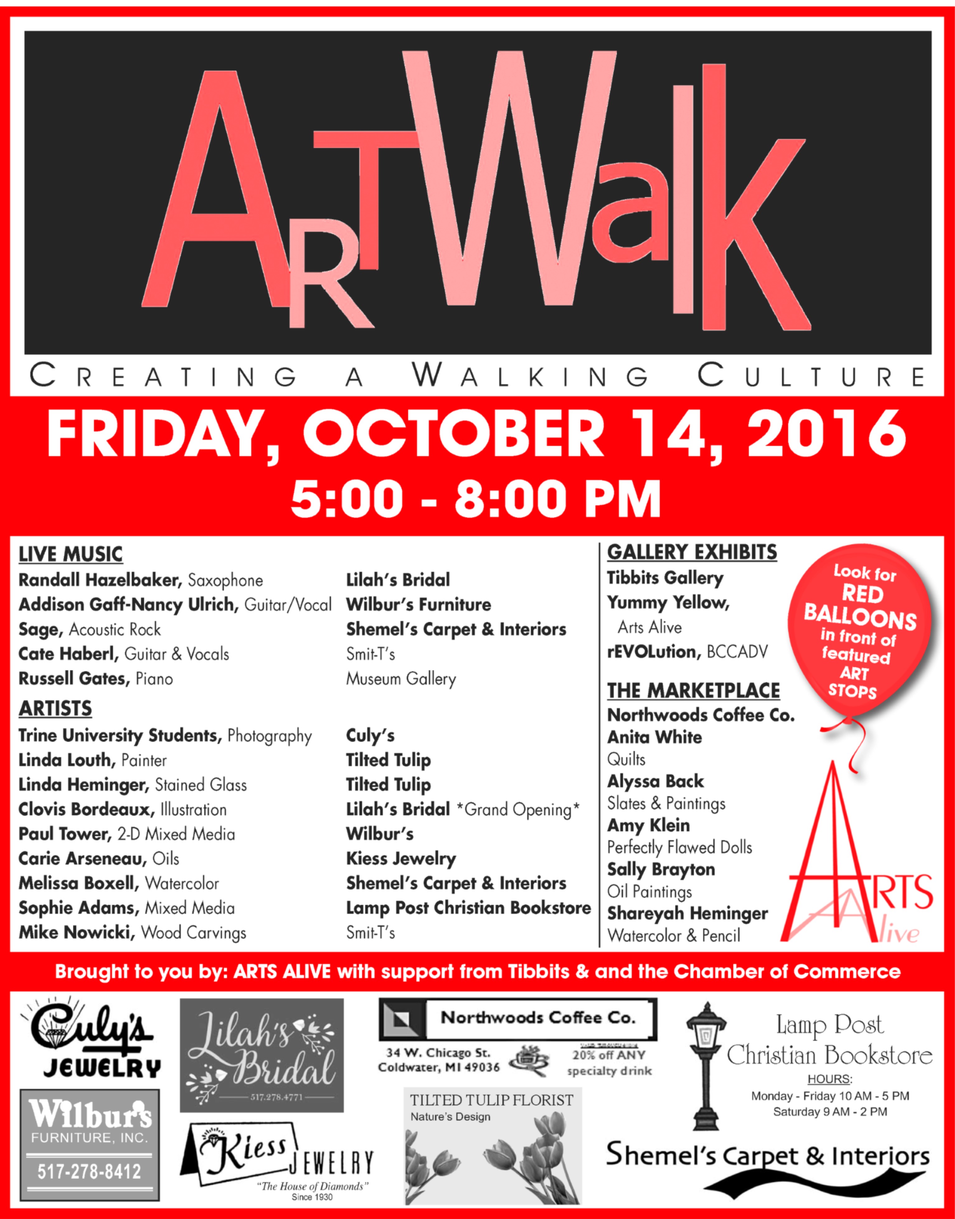 Arts Alive will host its annual Fall Art Walk in Downtown Coldwater this Friday, October 14, 2016 from 5-8 pm. Stroll through 10 unique locations and view original works of art, meet the artists and listen to a variety of live music. Please join us in supporting the arts at this free event!