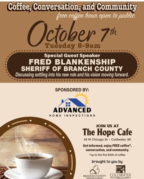 Enjoy a free cup of coffee, connect with friendly faces, and hear what’s happening in our community. Whether you're a regular or it's your first time, it's the perfect chance to start your day with good company and great conversation. Sponsored by @Advanced Home Inspections of Coldwater.