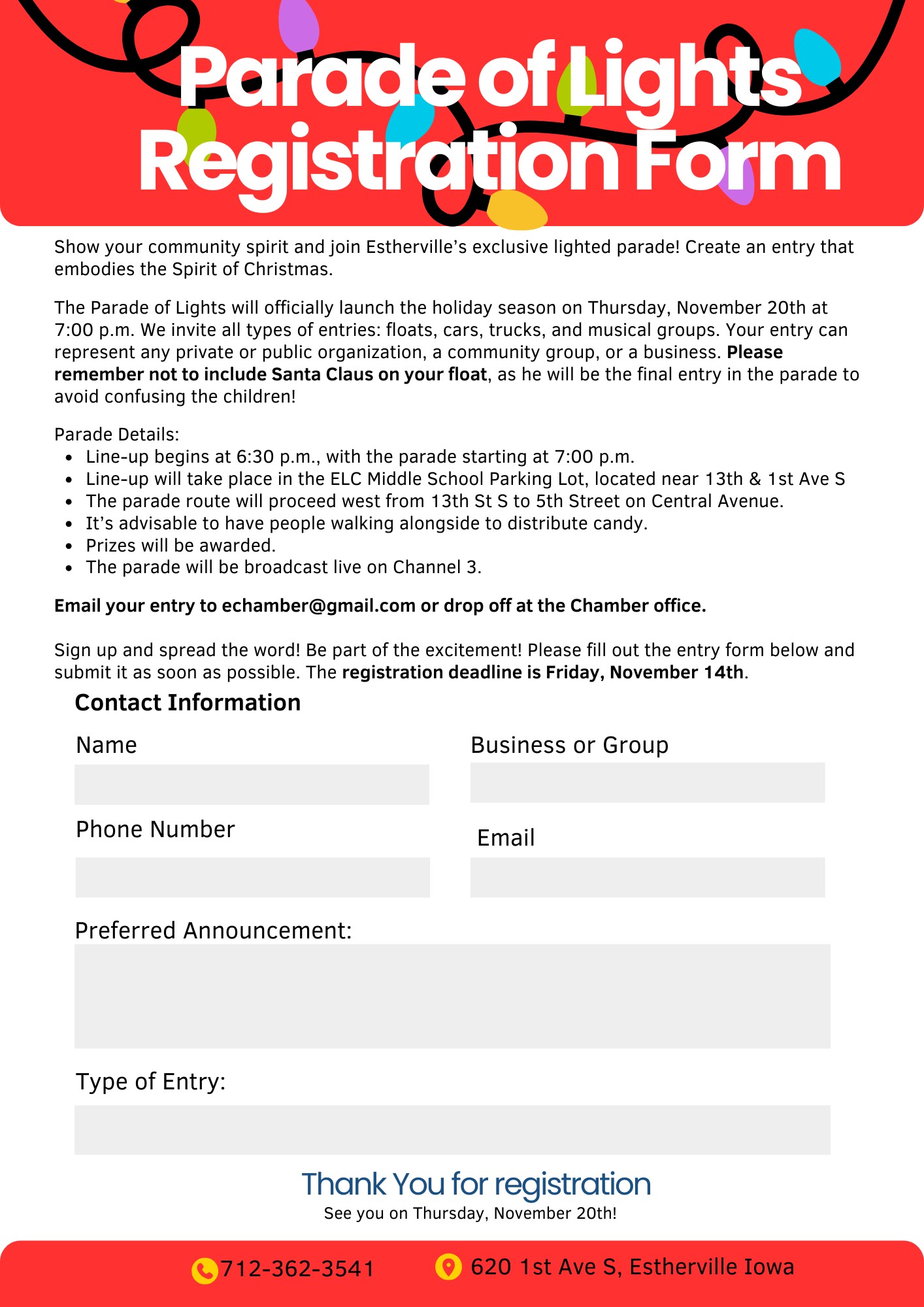 Join us for the festive cheer at Holiday in the Ville! This delightful event takes place on Thursday, November 20th, in the heart of Downtown Estherville, promising an enchanting start to your holiday season. From 4-7 p.m., indulge in the Chocolate Walk, where downtown stores and businesses will offer an array of delectable chocolate treats to enhance your holiday shopping experience. Between 5-6:30 p.m., enjoy complimentary horse-drawn wagon rides around Library Square and Downtown, adding a touch of nostalgia to your evening. At 7 p.m., gather along Central Avenue for the Annual Parade of Lights—a dazzling display sure to captivate all ages. After the parade, join us in Library Square for the magical Lighting of the Square, featuring a special appearance by Santa and Mrs. Claus, who will help illuminate the square and the grand tree. If you'd like to participate in the Parade of Lights, be sure to register HERE! Come and make cherished memories with us this holiday season!