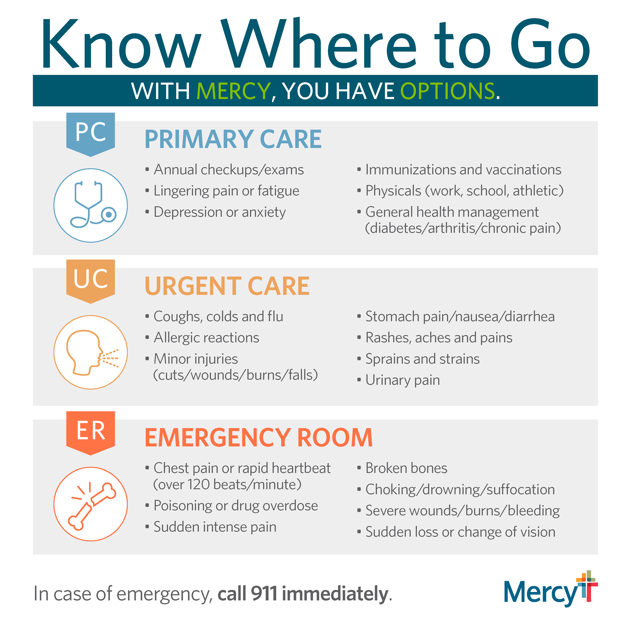 Know where to go now, so you're ready later. For non-life-threatening care, see your scheduling options with Mercy.