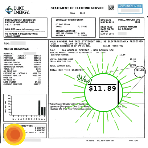Check out the electric bill from Wauchula Service Center to see how much of a difference solar energy makes! Typically, the monthly electric bill for a branch this size would cost about $2,800. Suncoast is proud to have six different solar service centers.