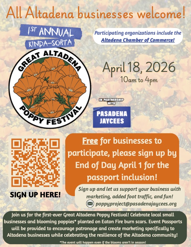 | 4/17/2026 | We are thrilled to share that the Altadena Chamber has been selected as a 2026 Business Makes LA County Work (Bizzi) Awards honoree in the Supervisor District 5 Award – Business Nonprofit of the Year.