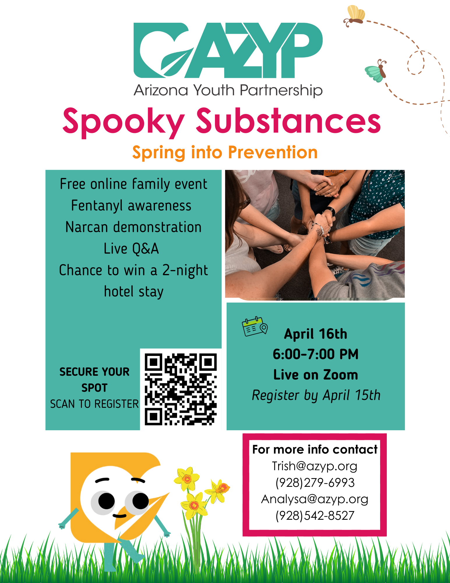 | 4/16/2026 | Arizona Youth Partnership (AZYP) invites families to join our virtual Spooky Substances: Spring into Prevention event. This free online session is designed to raise awareness about fentanyl and provide practical education on prevention and response, including a Narcan demonstration and live Q&A. This event is a great opportunity for parents and youth to learn together, ask questions, and gain tools to support healthy decision-making and safety in our community. Participants who attend will also have the opportunity to enter a raffle for a 2-night hotel stay. Register using the QR code on the flyer or contact us for more information. more info... |