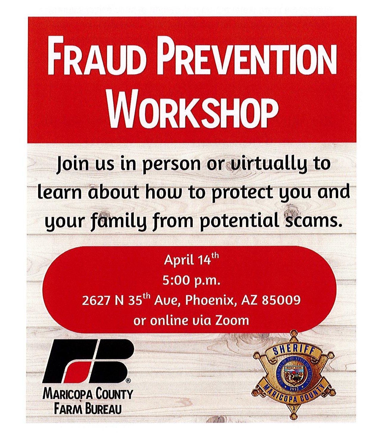 Maricopa County Farm Bureau invites you to our Fraud Prevention Seminar! This join effort with the Maricopa County Sheriff's Office aims to update you on the latest fraud tactics and provide you with the knowledge and resources to protect you and your family. All are welcome to join us in person or virtually! RSVP |