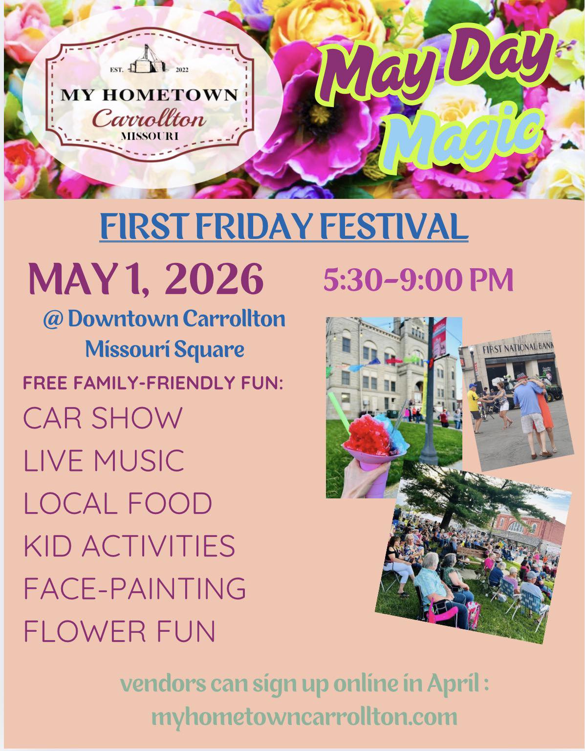 | 5/2/2026 | Discover fresh, local flavors at the Carrollton Farmer's Market! Join us every Saturday, May - September at the new My Hometown Park on the southeast corner of our beautiful Carrollton Square for the best seasonal produce, homemade goodies, and friendly community vibes. Support local farmers and enjoy the taste of homegrown goodness every week! more info... |
