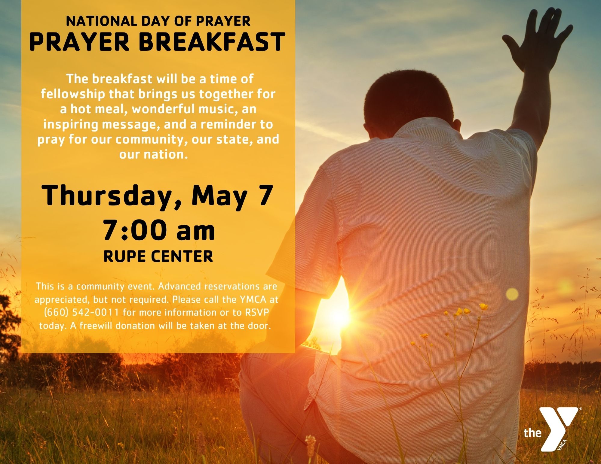 | 5/7/2026 | Join us for our Annual National Day of Prayer Breakfast. The breakfast will be a time of fellowship, music, and an inspiring message to pray for our community, our state, and our nation. A free will donation will be taken at the door. Please call the YMCA at 542-0011 or click the registration link below. If you would like to co-sponsor the event, please contact Kathy Lock for more details. more info... |