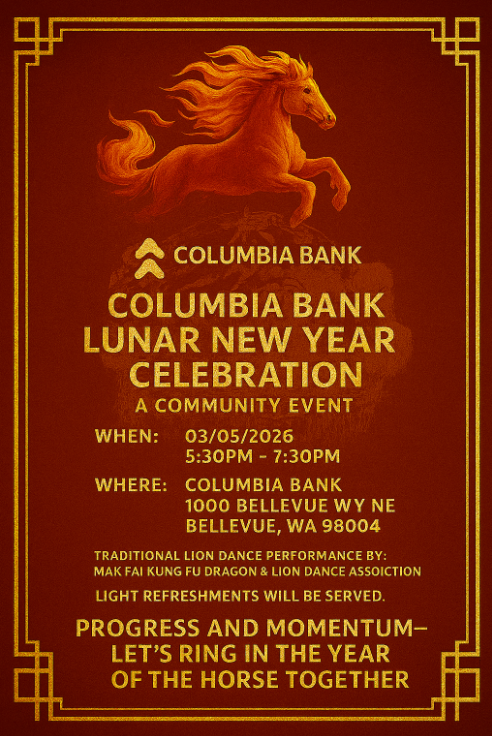 | 3/5/2026 | Back by popular demand, join Columbia Bank in this year's Lunar New Year celebration. This is a wonderful community event where family and friends are more than welcome to join in on the celebration. There will be a traditional lion dance performance by Mai Fai Kung Fu Dragon & Lion Dance Association. Light refreshments will be served. Let's come together to celebrate this joyous occasion with great food and traditional lion dance performances! To register, please make sure to email Tommy Wang at TommyWang@ColumbiaBank.com. more info... |