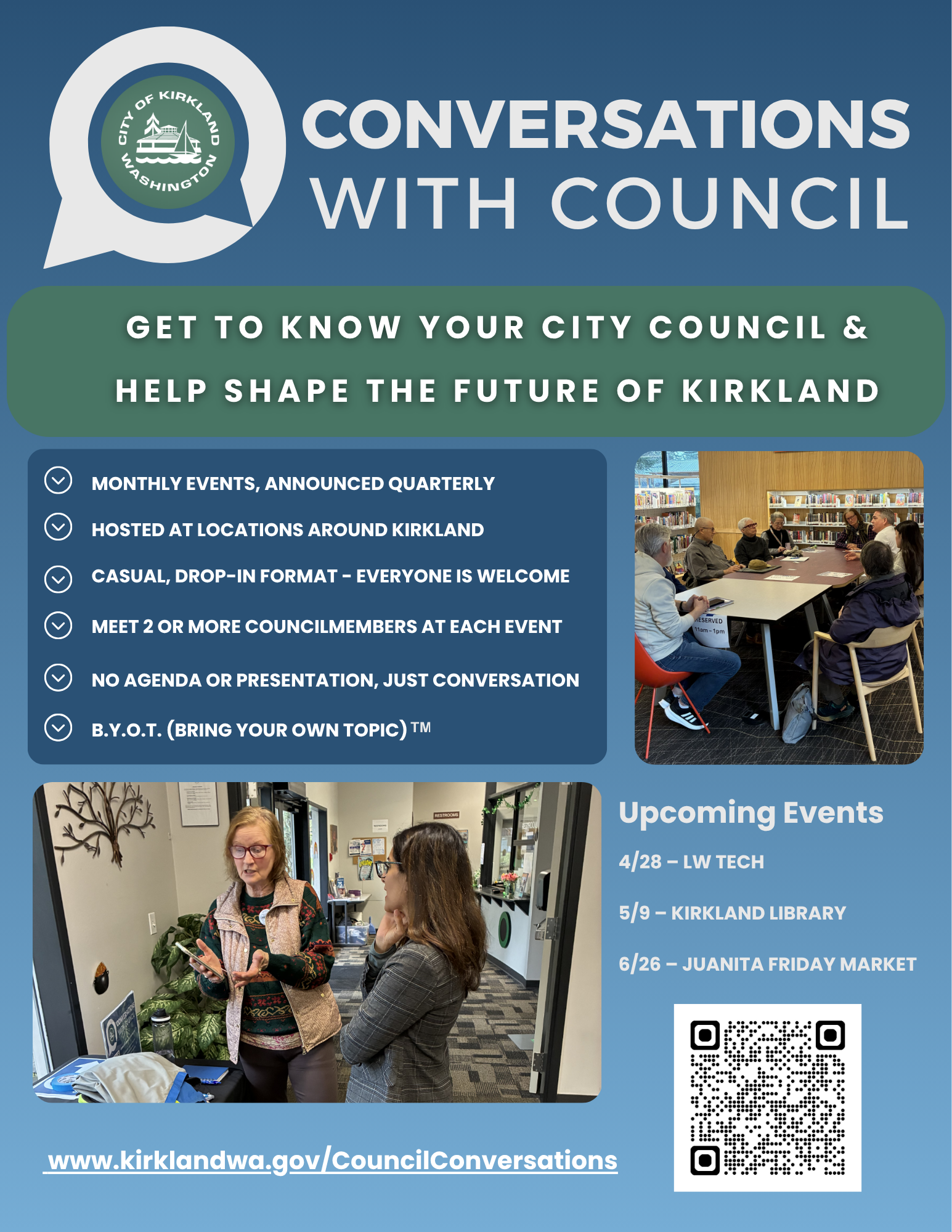 | 4/28/2026 | Join the City of Kirkland for Conversations with Council, a new community engagement program offering casual, monthly opportunities to connect with your City Councilmembers at locations across Kirkland. These drop-in sessions are designed for open conversation—no agenda or presentations. Community members are invited to stop by, bring their own topics, ask questions, and share ideas on the issues that matter most to them. Whether you have a specific concern or just want to connect, this is a chance to engage directly with Councilmembers in a relaxed setting outside of formal Council meetings. All are welcome. more info... |