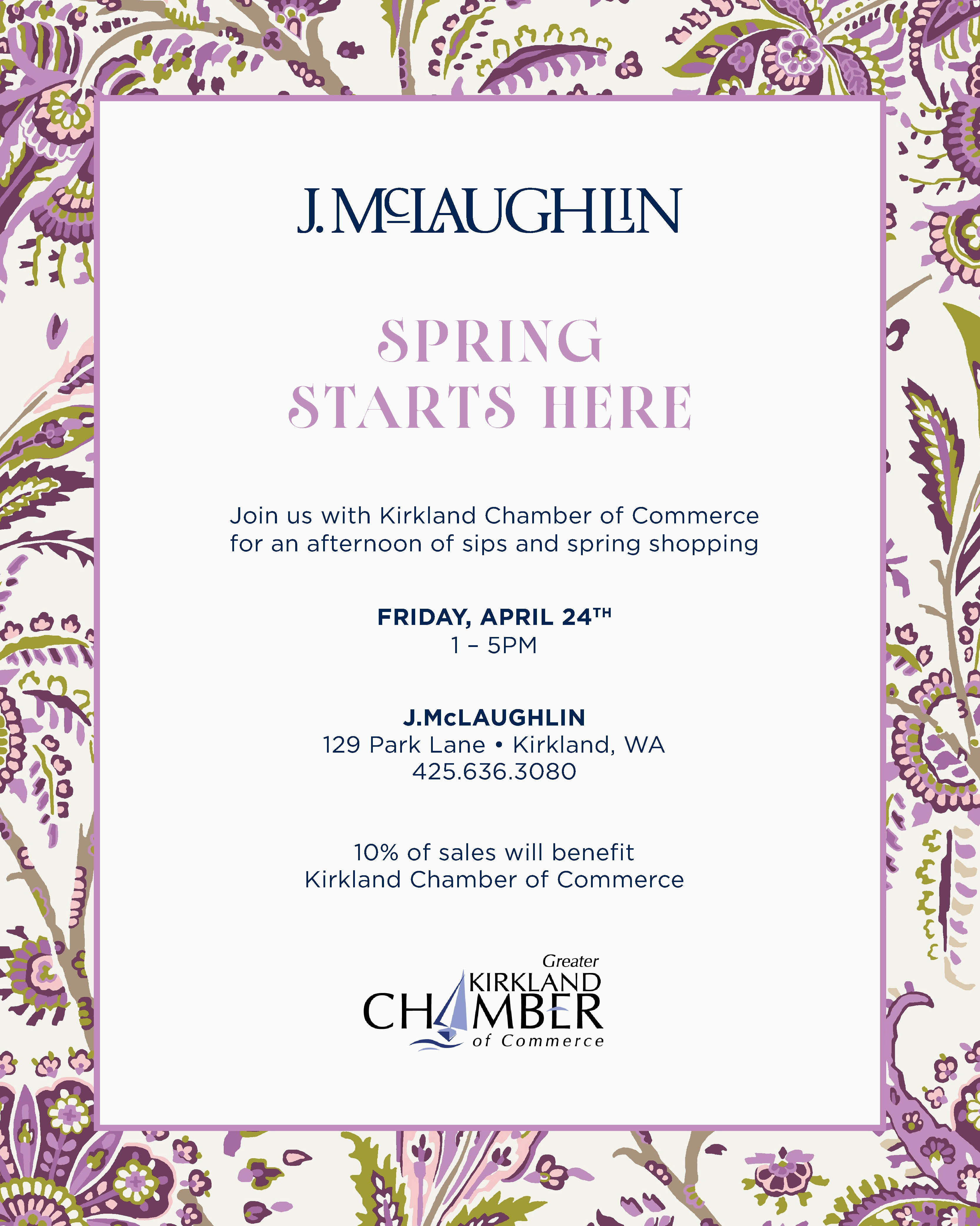 | 4/24/2026 | Join the Kirkland Chamber and J.McLaughlin for an afternoon of sips and spring shopping. 10% of sales will benefit the Kirkland Chamber of Commerce. Spring is served! Embrace the color and confidence of the season with great clothes made to move easily from day to night, work to wekend, and season to season. Our effortless styles are yours to discover at J.McLaughlin Kirkland. more info... |