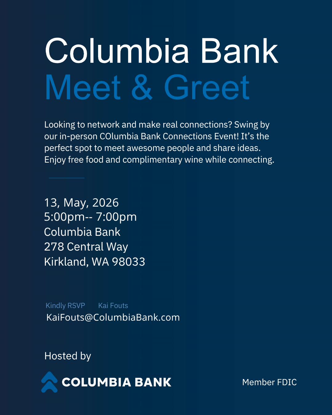 | 5/13/2026 | Looking to network and make real connections? Swing by our in-person Columbia Bank Connections Event! It’s the perfect spot to meet awesome people, share ideas, and build relationships that matter. Enjoy free food and complimentary wine while connecting with local business owners, professionals, and community partners. Don’t miss out on this chance to connect face-to-face, exchange ideas, and discover opportunities that can help your business grow. more info... |