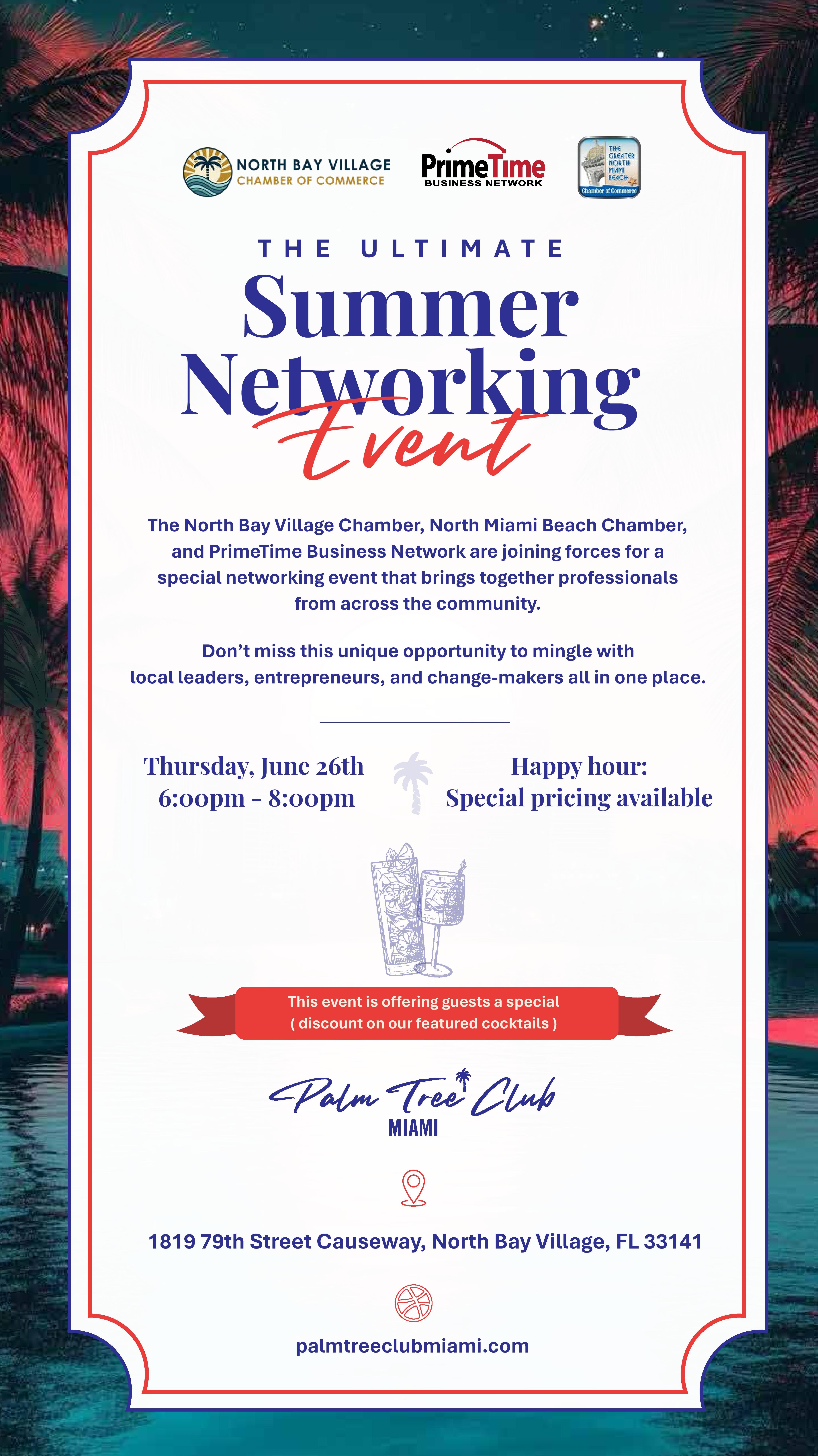 Thursday, June 26 Pre-July 4th Multi-Chamber/ Business Summer Cocktails & Networking Celebration on the WaterJoin the North Miami Beach Chamber, North Bay Village Chamber & PrimeTime Business Partners Cocktail & Networking Pre-July 4th Event on the Water