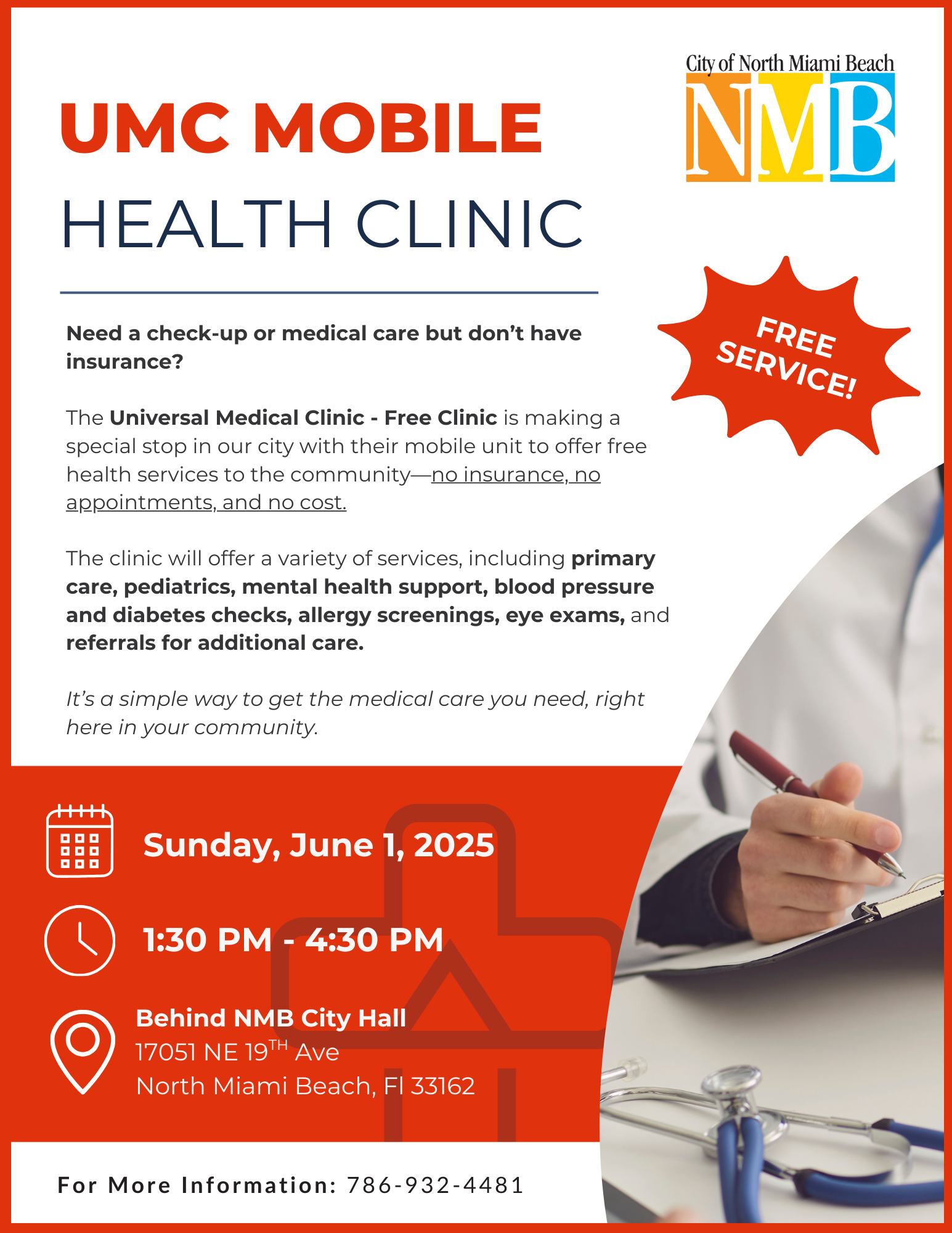 Visit the UMC Mobile Health Clinic on Sunday, June 1 at 1:30 PM behind NMB City Hall. Free primary care, screenings, mental health support, and more!