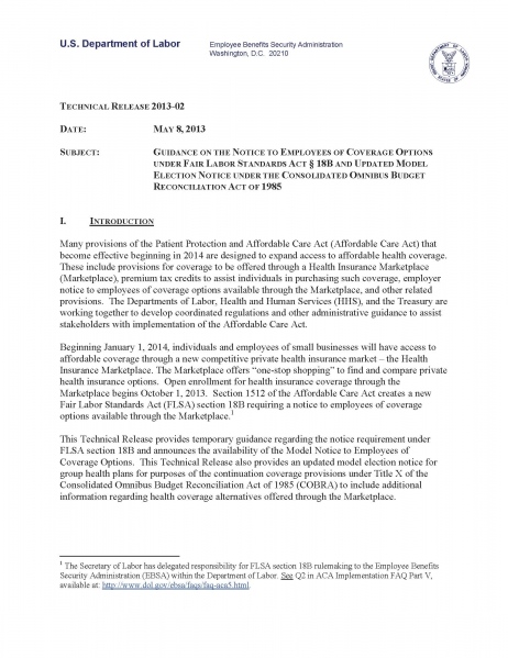 The link for Technical Release 2013-02 is http://www.dol.gov/ebsa/newsroom/tr13-02.html and is also attached for your convenience should you like to review the details to avoid non-compliance.  Employers failing to deliver the Notice would be violating the FLSA and the ACA, and may be subject to investigation and penalties.  Employees complaining about not receiving the Notice (or reporting the violation) would have employment protections under the ACA.