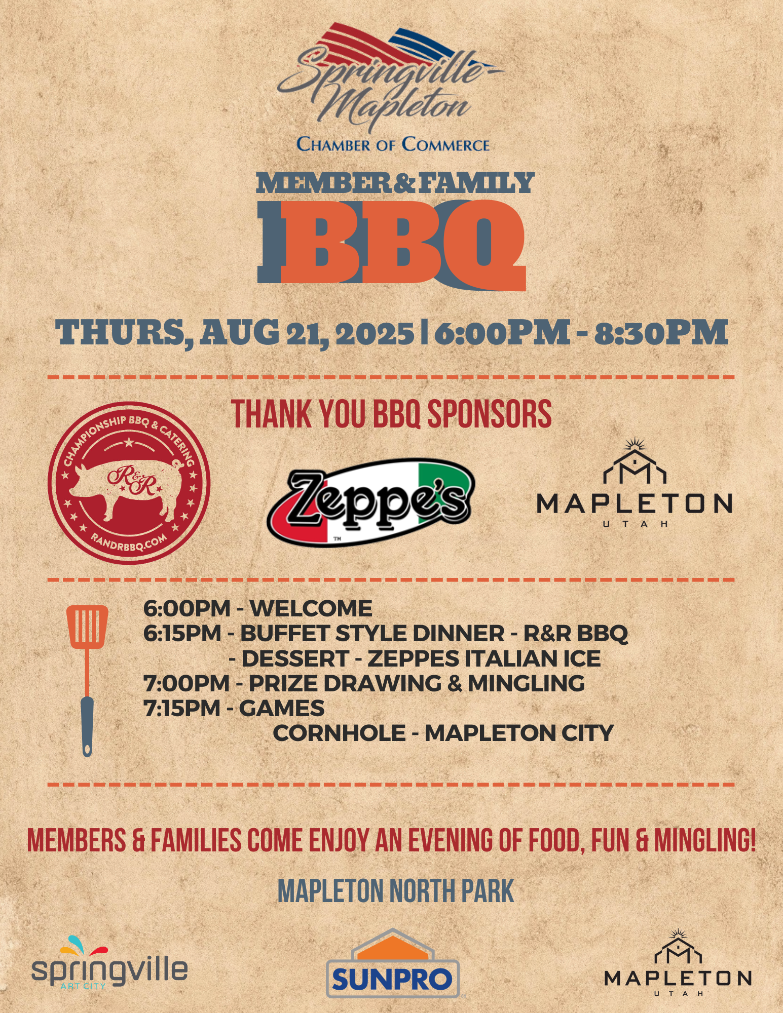 Thursday, August 21st at 6pm - Member and Family Chamber BBQ, Mapleton City Park, Sponsors: R&R BBQ, Zeppes Italian Ice, Mapleton City