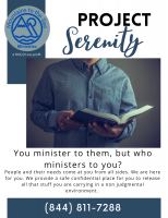 Project Serenity: Provides a safe place for ministry leaders to vent, get trauma and other people's issues out of their minds. Everyone feels better after they bring all their issues to the preacher, pastor, worship leader, or prayer intercessors. But... where do those leaders go where they can feel safe and not judged? Project Serenity is 100% confidential.