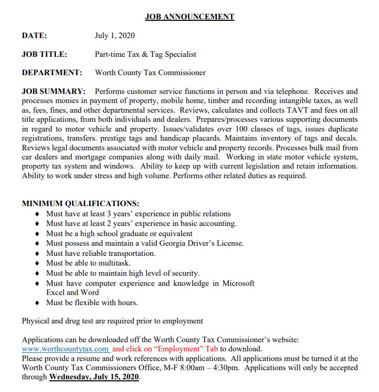 Position if Monday-Friday from 8:00 am to 5:00pm with an hour for lunch. All applicants must complete a full employee application. Applications can be picked up in the Sheriff's Office and should be returned to the Worth County Sheriff's Office. Deadline for application is Monday, July 20, 2020 at 5:00 pm. Projected start date will be Monday, August 3, 2020.