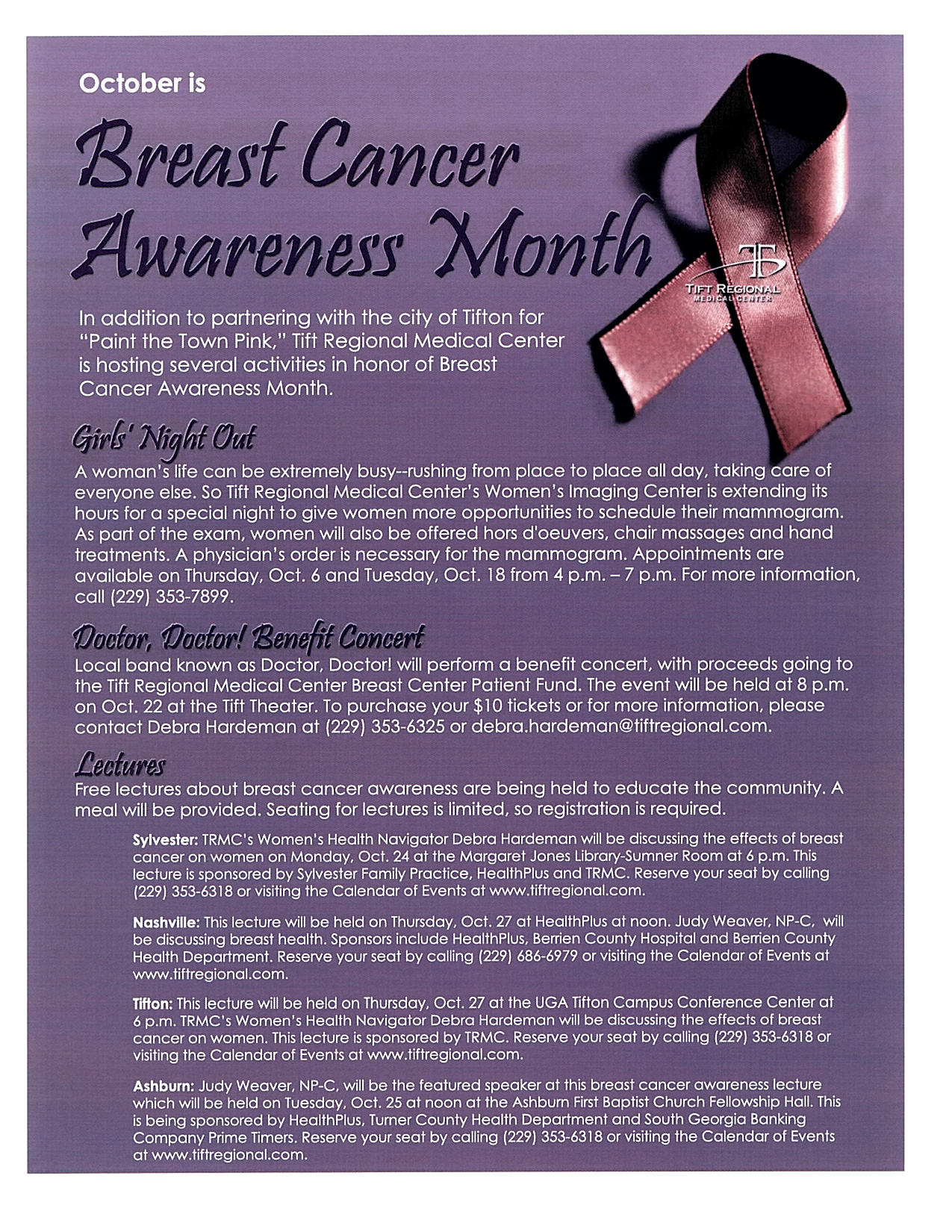 Girl's Night Out A woman's life coan be extremely busy-rushing form place to place all day, taking care of everyone else. Tift Regional Medical Center's Women's Imaging Center is extendingits hours for a special night to give women more opportunities to schedule their mammogram. Sylvester-HealthPlus/ Sylvester Family Practice will be discussing the effects of breast cancer on women on Monday, Oct 24 at the Margaret Jones Library-Sumner Room at 6 p.m. Please call for reservation at (229)353-6318 or visiting the Calendor of Events at www.tiftregional.com. or www.chamberorganizer.com/sylvesterworthcc/docs/Sylvester Family Practice Breast Cancer Awareness.jpg _____________________________________________ _____________________________________________