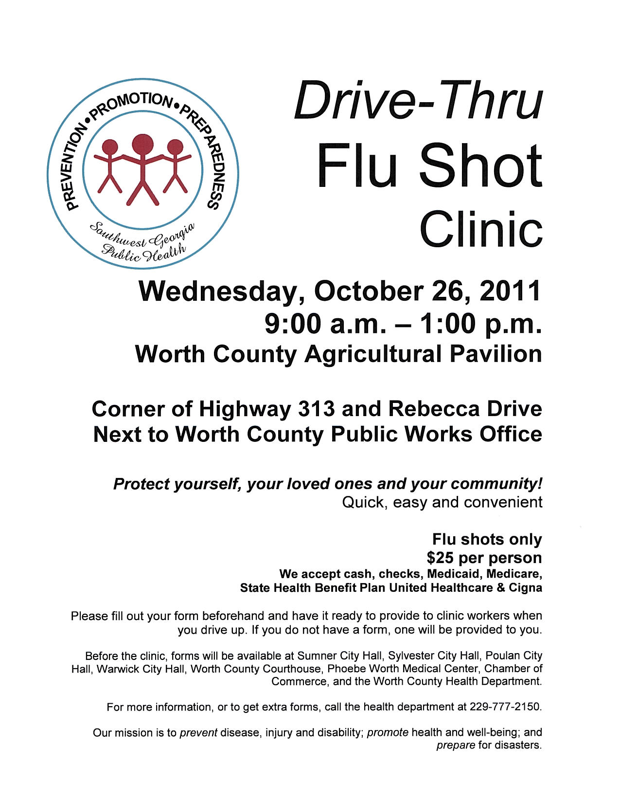October 26th: The Worth County Health Department will be hosting a Drive-Thru Flu Clinic on October 26, 2011 from 9:00AM to 1:00 PM. The event will be held at the Agricultural Pavilion at the corner of Highway 313 and Rebecca Drive next to Worth County Public Works office. Shots are $25 per person. For more information please call 229-777-2150. Forms can be picked up at the Chamber. Please see attachment for more details: www.chamberorganizer.com/sylvesterworthcc/docs/health dept logo.jpg.