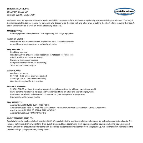 For more information or to apply, call (229) 776-8566 or email cari@specialtysalesco.com