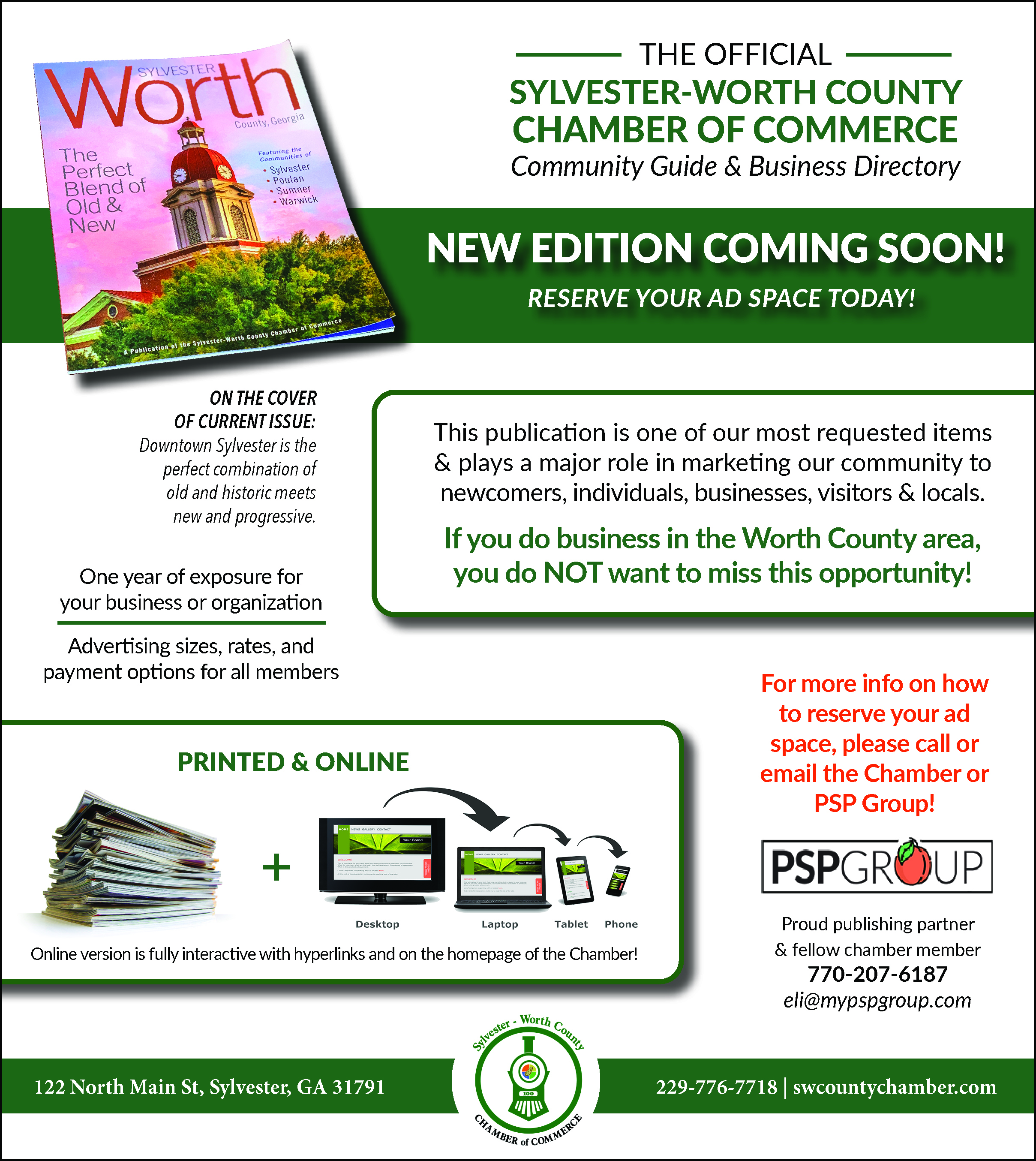One great member benefit is you are listed in the Magazine Business and Resource Directory for FREE! You also get a discounted price on your ad. Just let the PSP Group know you are a Member of the Sylvester-Worth County Chamber of Commerce.