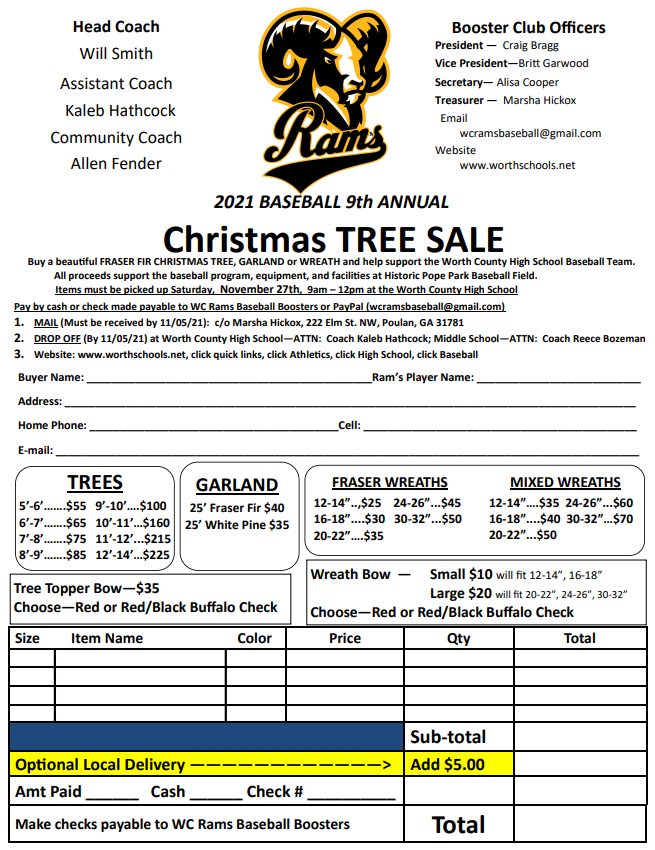 The Worth County Rams Baseball Team is kicking off their 9th Annual Christmas Tree Sale. Below you will find the order form that contains more information. Please consider supporting the Rams Baseball Team!