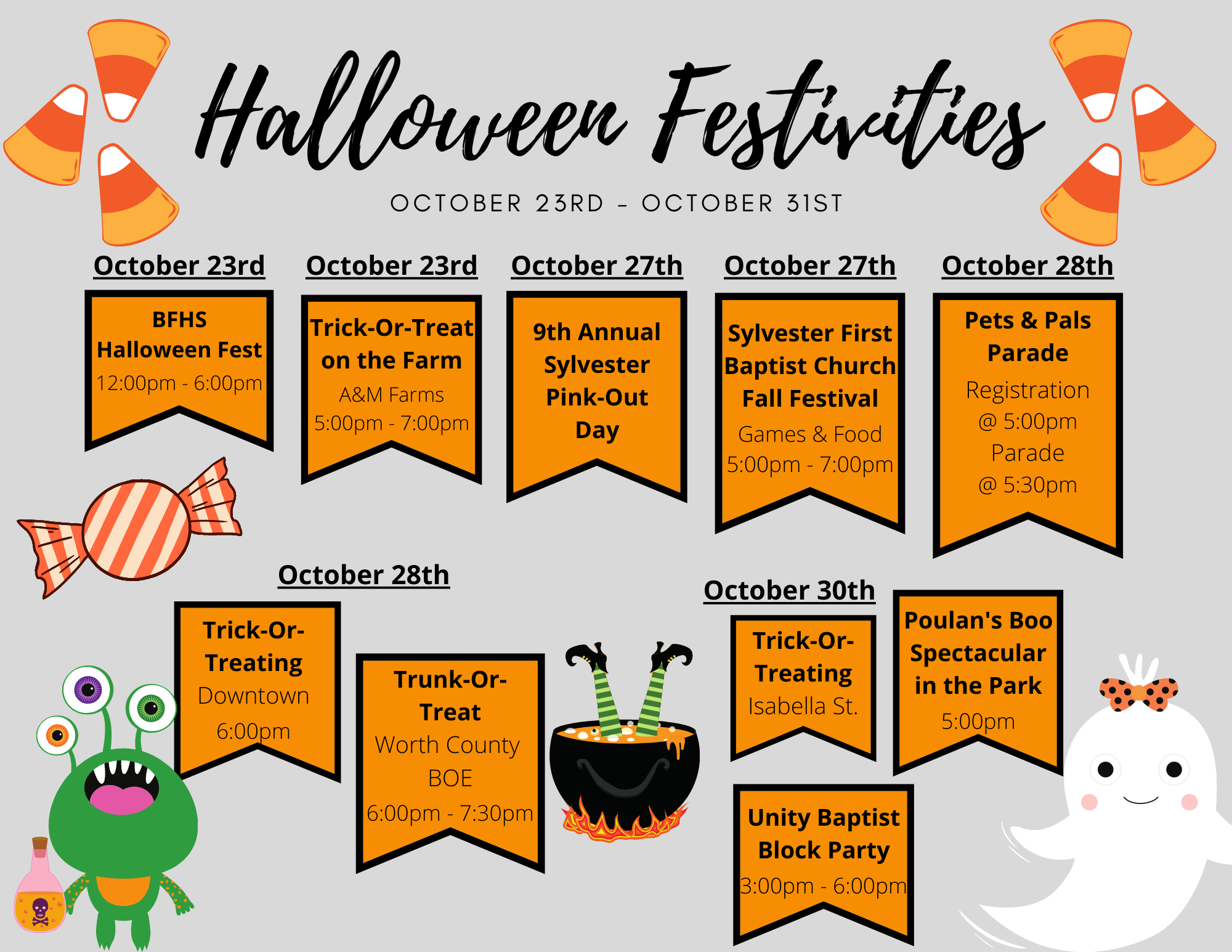 Sylvester-Worth County has lots in store for Halloween this year. Below we have listed many of the events that will take place in our community! So please help us spread the word by sharing this post!