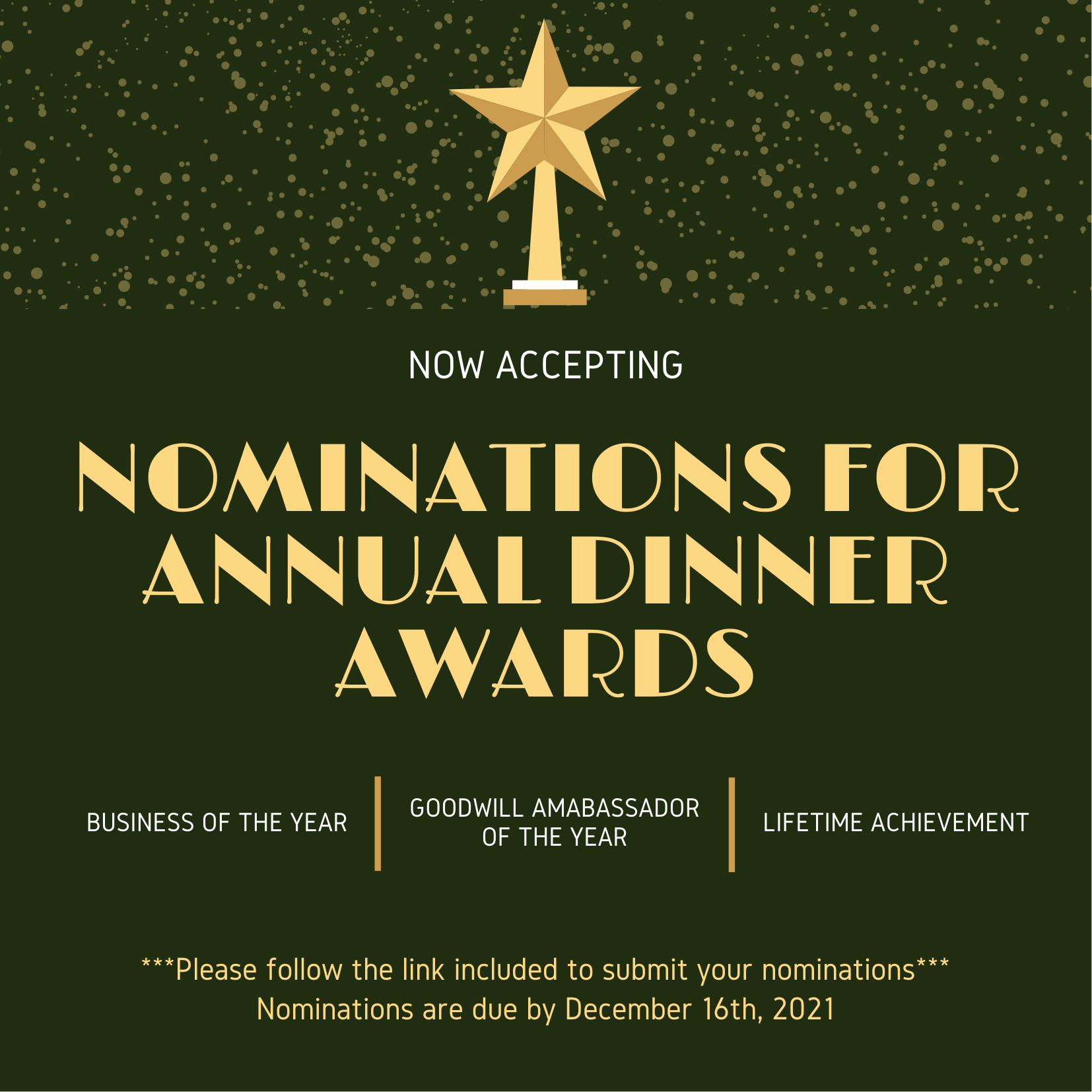 We are opening up the Award nomination process and have attached the link below. Please take a moment to nominate a Business of the Year, Goodwill Ambassador of the Year, and the Lifetime Achievement Award.