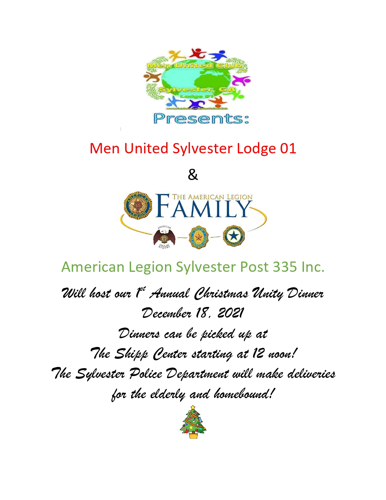 This is a joint effort between the American Legion Sylvester Post 335 and Men United Sylvester Lodge 01. It is their wish to provide a meal for the elderly and those less fortunate in our community. They will be distributing up to 400 meals at 12 pm on Dec. 18th! These meals will be ready for pick up at the Shipp Center at that time. There is no cost for the recipients! The Sylvester Police Department will be delivering to the elderly and those who are confined to their homes. They would like to thank the local businesses that have come together to help make this event happen!