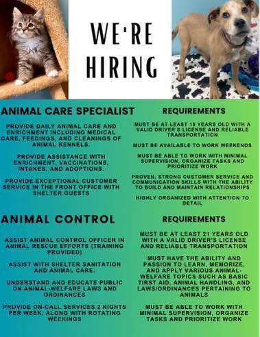 Must be at least 18+ (Animal Care Specialist) or 21+ (Animal Control) with a valid driver's license and reliable transportation