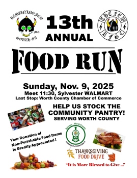 Our goal is to create 100 boxed meals for families in need right here in Worth County. We’ll be collecting nonperishable food donations from November 3–19, Monday through Friday, 8 a.m.–5 p.m. at the Chamber office.