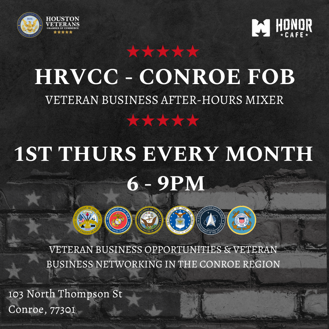 Where: Honor Cafe, 103 N Thompson St Suite 101, Conroe, TX 77301, VOB & HRVCC Member When: 6:00 pm - 9:00 pm Attire: Business Casual