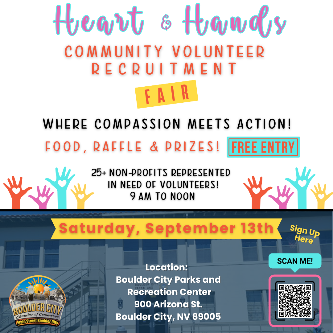 Sign Up today! Don't miss this opportunity to turn your compassion into action! Whether you're a seasoned volunteer or new to community service, there's a place for you at the Heart and Hands Community Volunteer Recruitment Fair. Mark your calendars, bring your friends, and join us in making a meaningful impact in Boulder City.