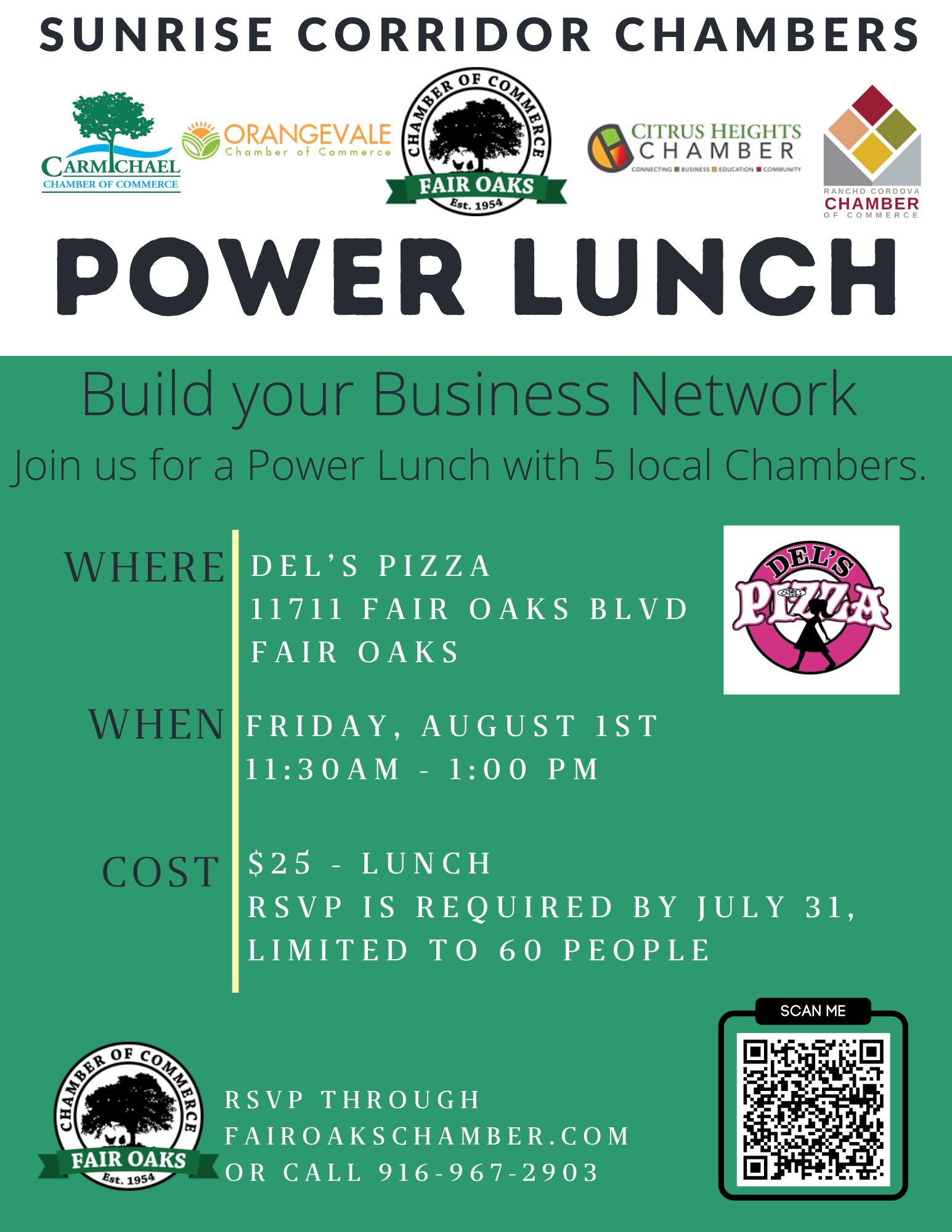 The Sunrise Corridor Power Luncheon is shared by the Fair Oaks, Citrus Heights, Carmichael, Orangevale, and Rancho Cordova Chambers of Commerce each quarter. Another way to expand your networking opportunities!