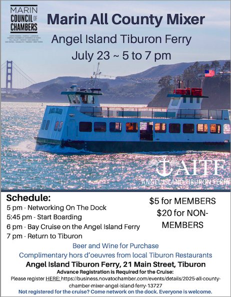 RSVP: If you are not a Novato Chamber member, you can select "continue as a guest). Eventbrite link: https://business.novatochamber.com/events/details/2025-all-county-chamber-mixer-angel-island-ferry-13727