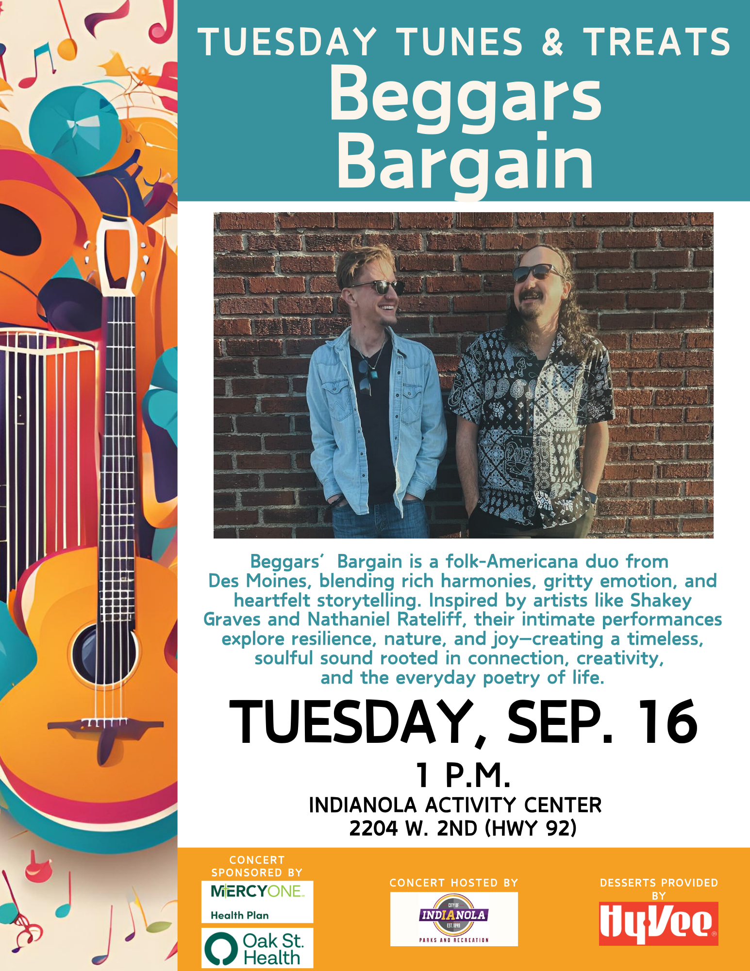 Free concert, thanks to MercyOne Health Plan and our Platinum Sponsor, Oak St. Health. Refreshments provided by Indianola Hy-Vee.