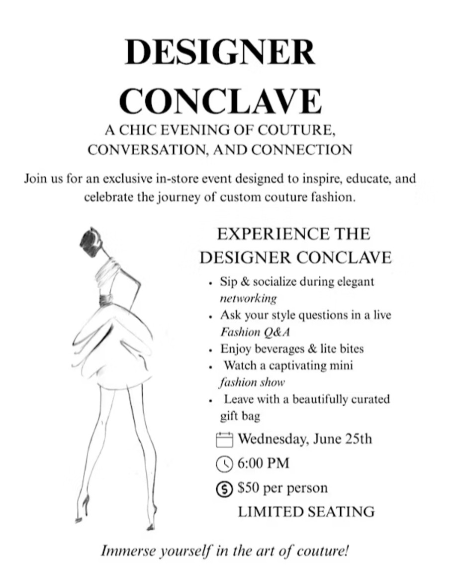 The Designer Conclave event will take place on Wednesday June 25th, from 6:00 PM to 8:00 PM, at the Sondra Falk Couture design studio, located at 7450 W Cheyenne Ave, Suite 112, Las Vegas, NV 89129. Space is limited to 20 participants, so please RSVP without delay, to make certain to reserve your seat!