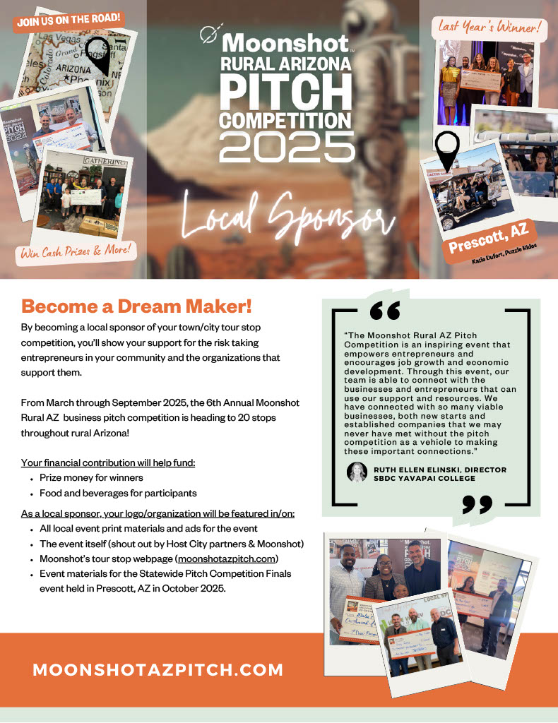 From March through September 2025, the 6th Annual Moonshot Rural AZ business pitch competition is heading to 20 stops throughout rural Arizona!