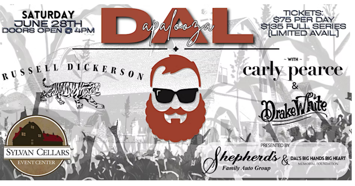 Kicking off the all-country night of Dalapalooza summer music festival is local favorite Hubie Ashcraft Trio, rising superstar Drake White takes the stage next, followed by Academy of Country Music Awards (ACM) and CMT Music Awards nominee Russell Dickerson. Headliner, Carly Pearce, has been nominated for 27 awards and won nine, includinga Grammy, three Academy of Country Music Awards, two Country Music Association Awards, two CMT Music Awards, and a Radio Disney Music Award.