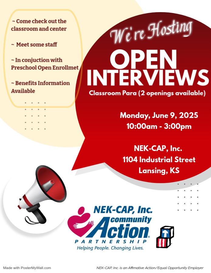 Are you interested in a career with NEK-CAP, Inc. and want to be a part of our amazing team? We're holding OPEN INTERVIEWS at our Head Start Center in Lansing!!